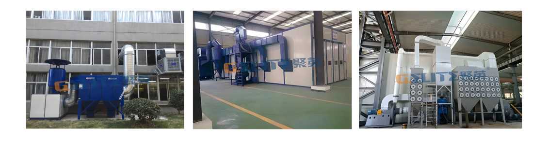 針對拋丸、噴砂等工藝產生的粉塵顆粒收集治理,根據收集形式不同可分為拋丸機預留口收集和噴砂房房體收集,配套旋風除塵器+筒式/袋式除塵器。