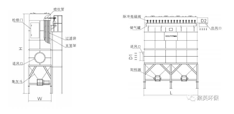 含塵氣體進(jìn)入脈沖袋式除塵器,氣流流經(jīng)灰斗,流速放慢,慣性作用使粗顆粒粉塵直接落入灰斗。起預(yù)收塵的作用,氣流隨后通過內(nèi)部裝有金屬骨架的濾袋,粉塵被捕集在濾袋表面,凈化后氣體匯集到出風(fēng)口排出,除塵器運行過程中,積附在濾袋上的粉塵越來越多,濾袋阻力增加,處理風(fēng)量逐漸減少,為正常工作,需對濾袋進(jìn)行清灰,由脈沖控制程序控制脈沖閥開啟,壓縮空氣由噴吹管各孔經(jīng)文氏管噴射到濾袋內(nèi),濾袋瞬間急劇膨脹,使積附在濾袋表面的粉塵脫落。清下粉塵落入灰斗,經(jīng)排灰系統(tǒng)排出機體。由此使積附在濾袋上的粉塵周期地脈沖噴吹清灰,使脈沖布袋除塵器始終保持高效運行狀態(tài)。